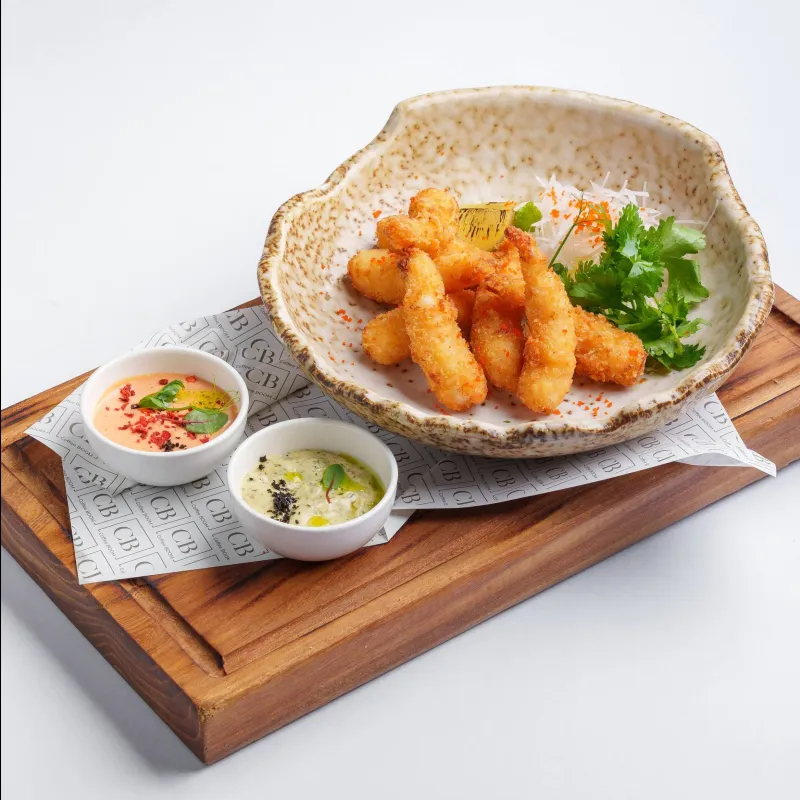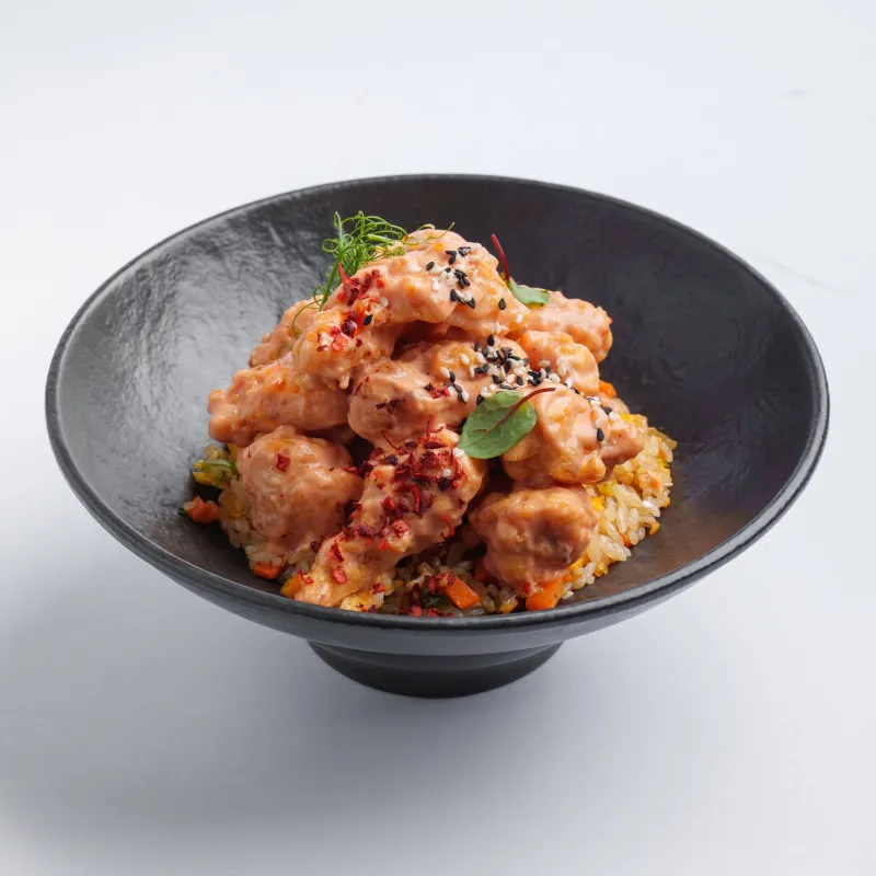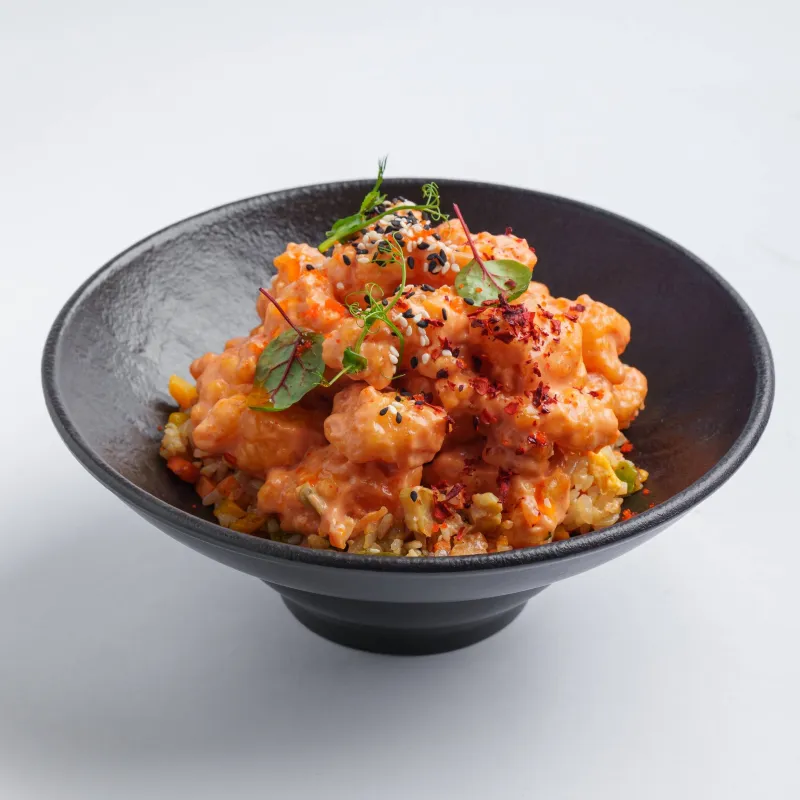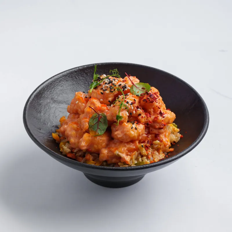 креветки в остром кляре с рисом и овощами, хлопья чили, масаго