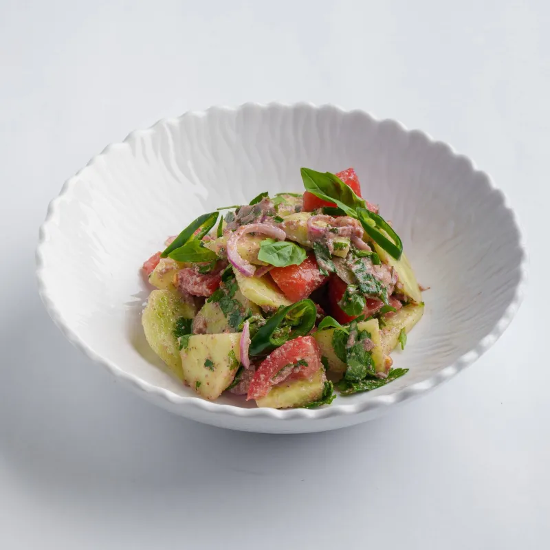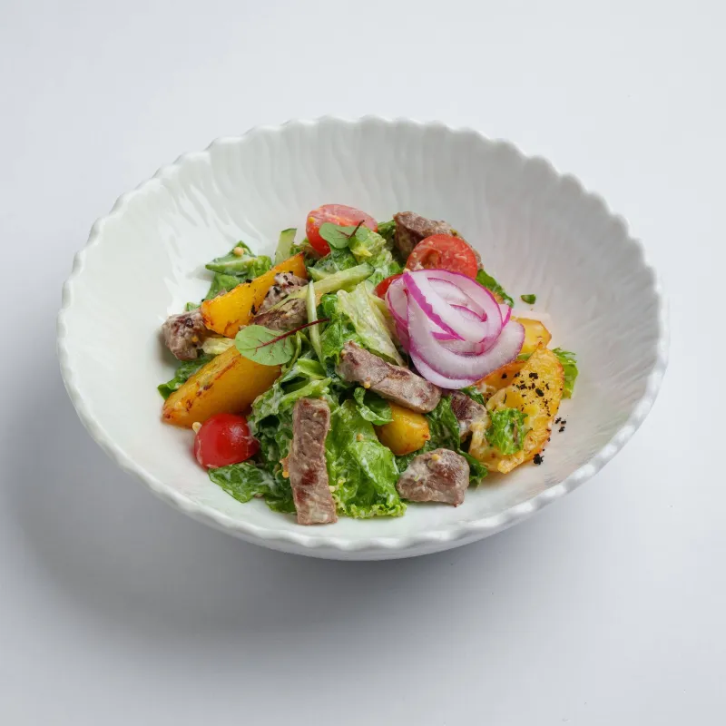 говяжья вырезка, картофель, листья салата, томаты черри, пармезан, маринованный лук, соус на основе домашнего майонеза и зернистой горчицы