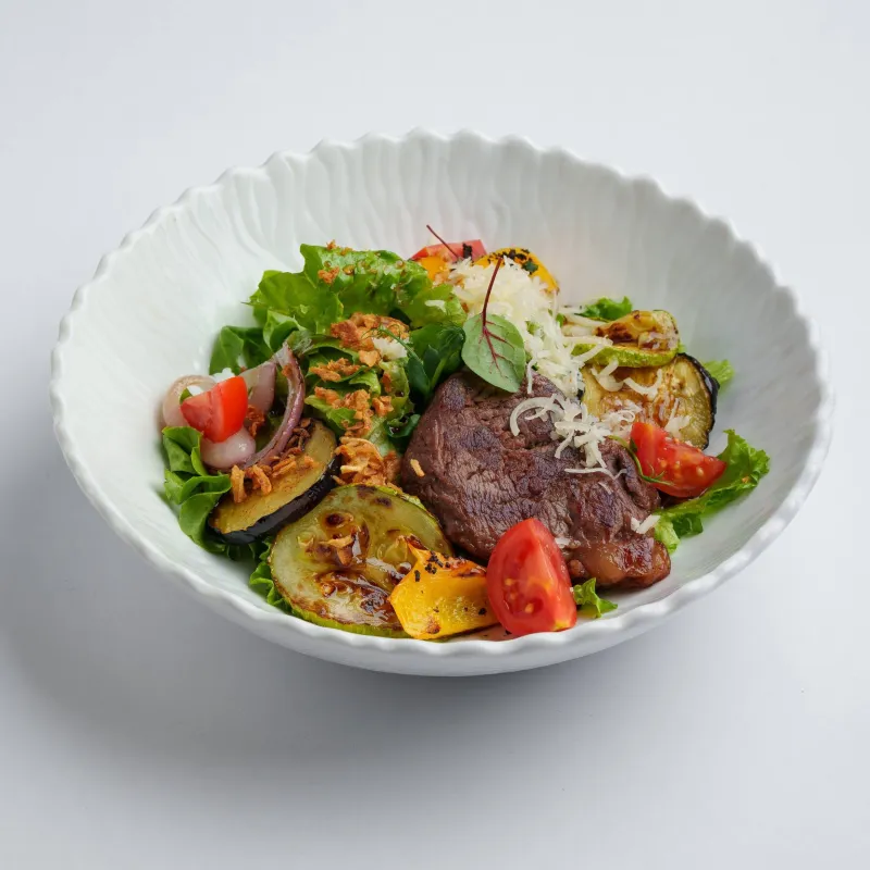 говяжья вырезка, лист салата, руккола, овощи гриль, томаты черри, крем бальзамик, пармезан, лук фри.