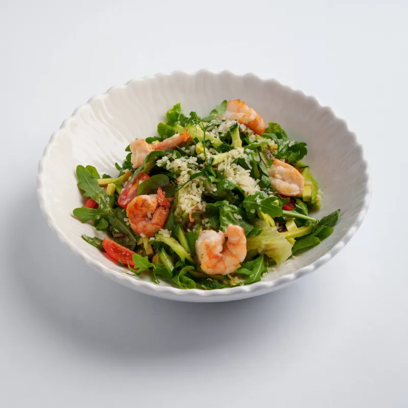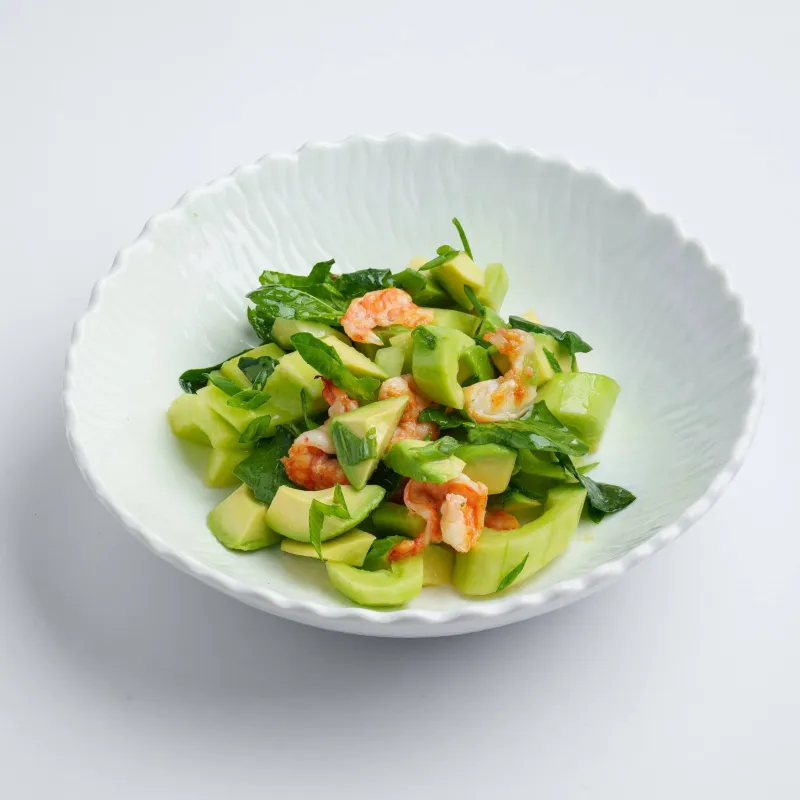 тигровые креветки, огурец, авокадо, шпинат, зеленый лук, заправка на основе оливкового масла, сока лайма и бальзамика