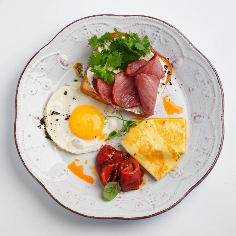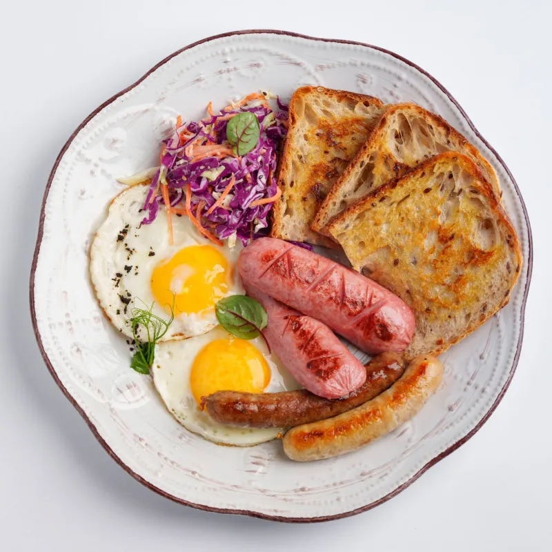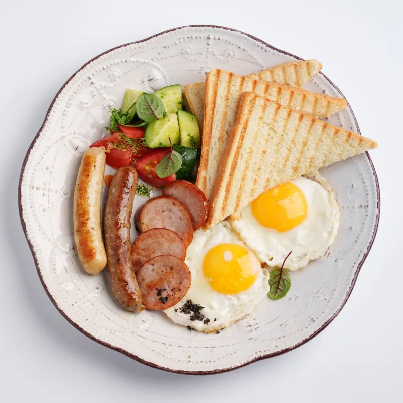 Глазунья, ветчина из индейки, куриная колбаска, говяжья колбаска, салат из свежих огурцов и помидоров, тосты
