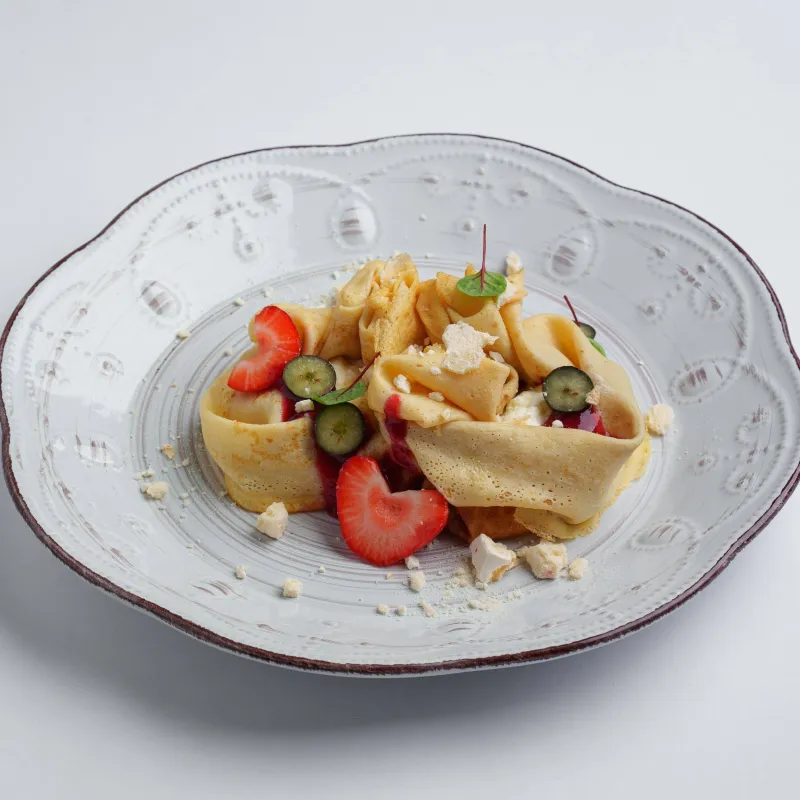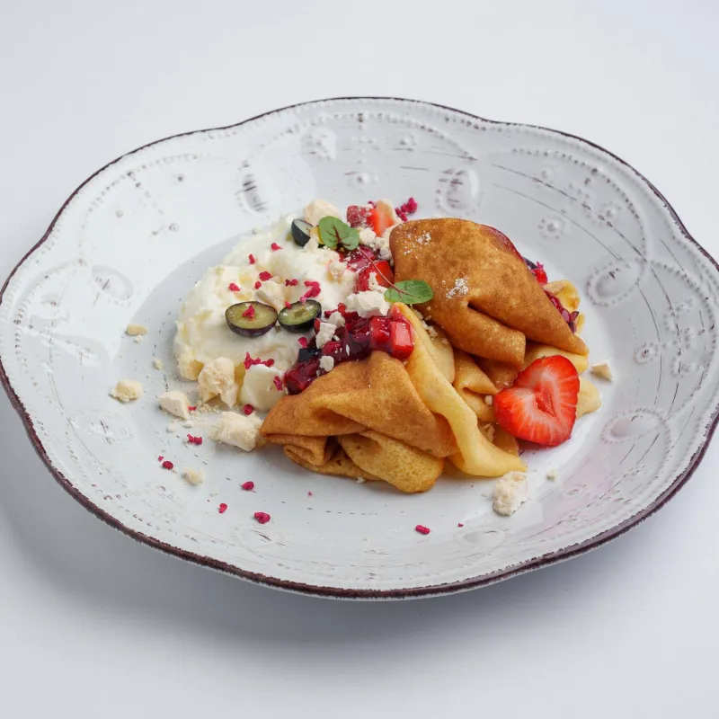 блины, клубника, голубика, взбитые сливки, сублимированная малина, безе, ягодный Тар-тар