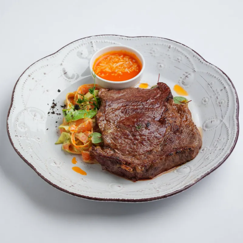 стейк из говядины зернового откорма, фетучини из моркови и цуккини в сливочном соусе с песто, подается с соусом айвар