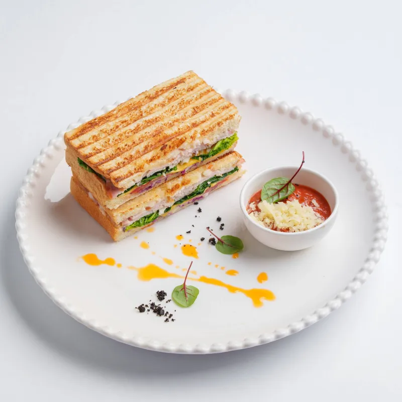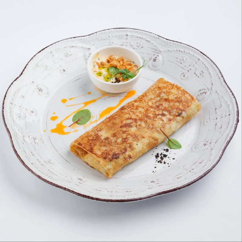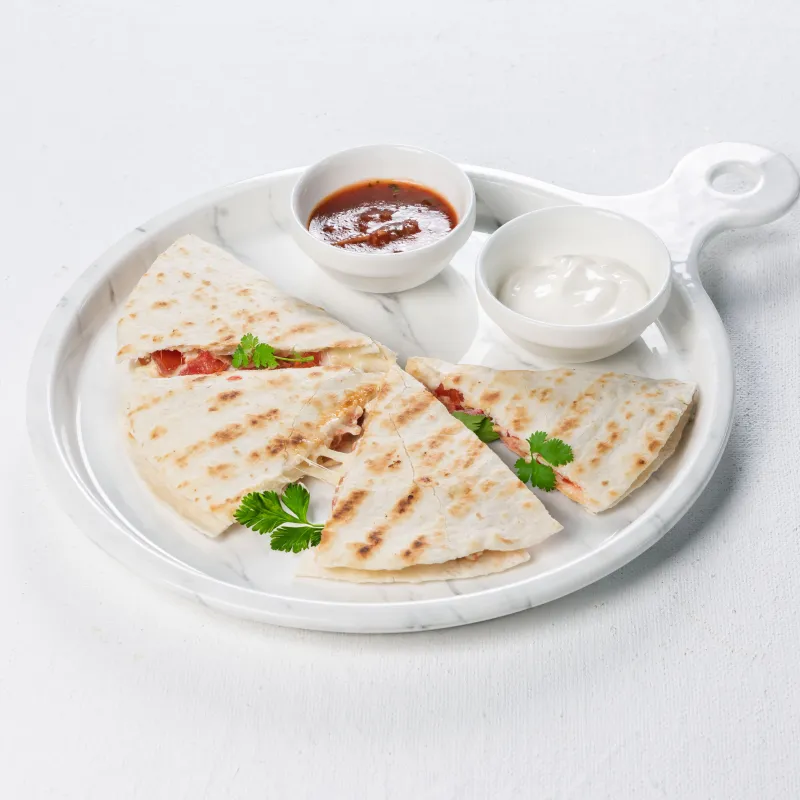 Блюдо мексиканской кухни, состоящее из пшеничной лепешки, наполненной сыром, сочными помидорами, луком, болгарским перцем, сладкой кукурузой, нежной курицей и фасолью в томатном соусе. Обжарена на сливочном масле до румяной хрустящей корочки. Подается с соусом Айвар и Дзадзики.