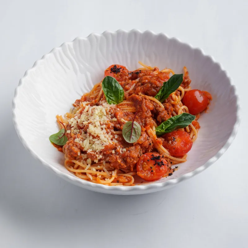 фарш из говядины, обжаренный в томатном соусе, томаты черри, пармезан, шпинат, микрозелень
