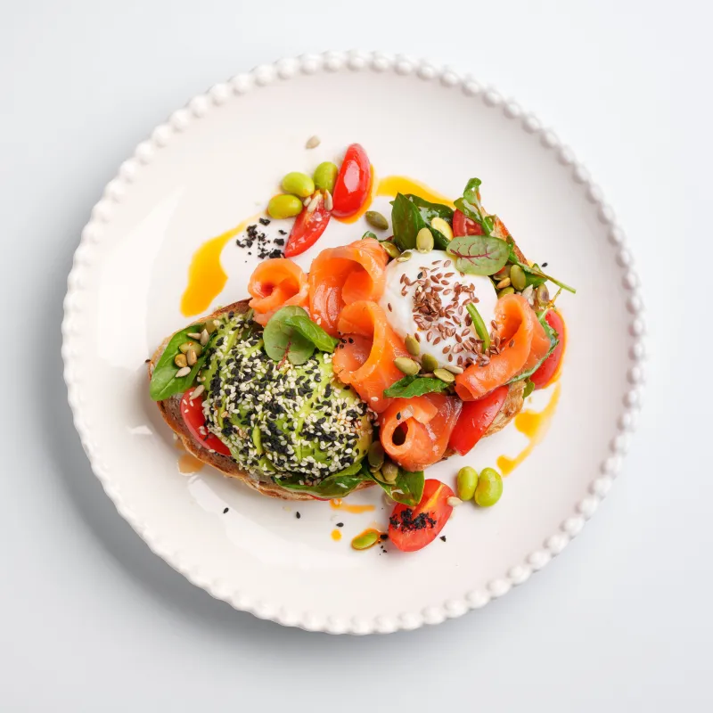 Злаковый хлеб, яйцо пашот, авокадо, микс из зелени, семга слабосоленая, микс из семян и орех кешью, дзадзики соус