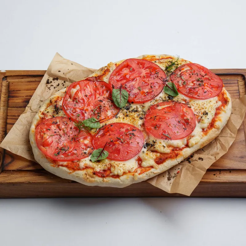 хрустящее воздушное тесто, сыр моцарелла, соус томатный, тонкие ломтики томата