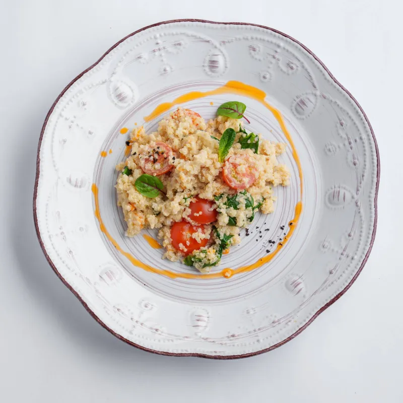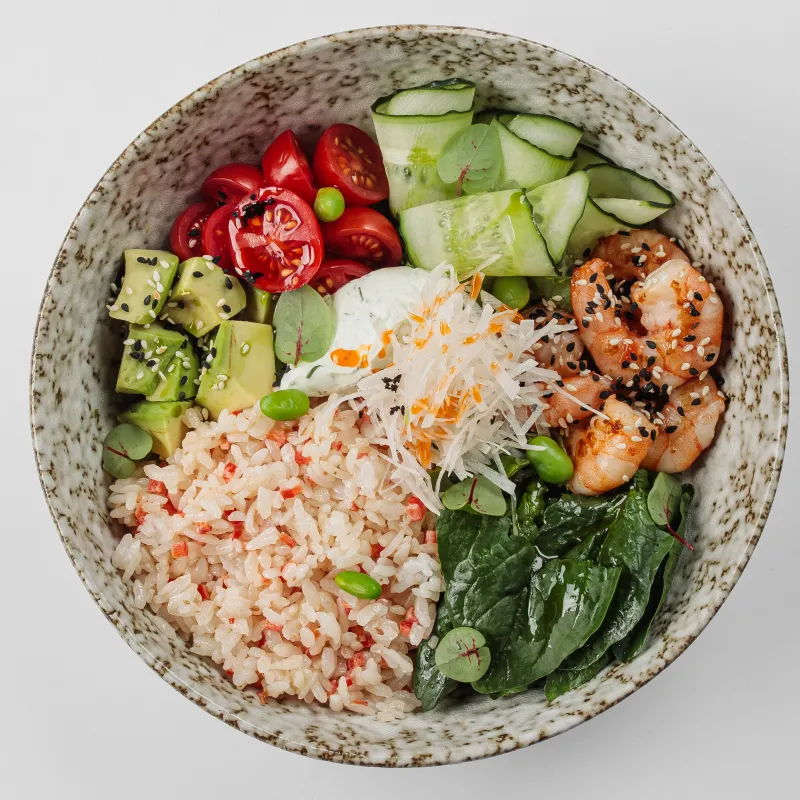 На выбор: киноа, черный рис, рис, креветки, авокадо, огурец, томаты черри, ореховый соус, соус свит чили, дайкон, фасоль эдемами