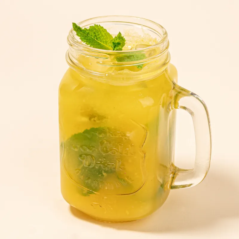 Мякоть манго, лимон,сироп маракуйя, газированная вода и мята. Слабогазированный
