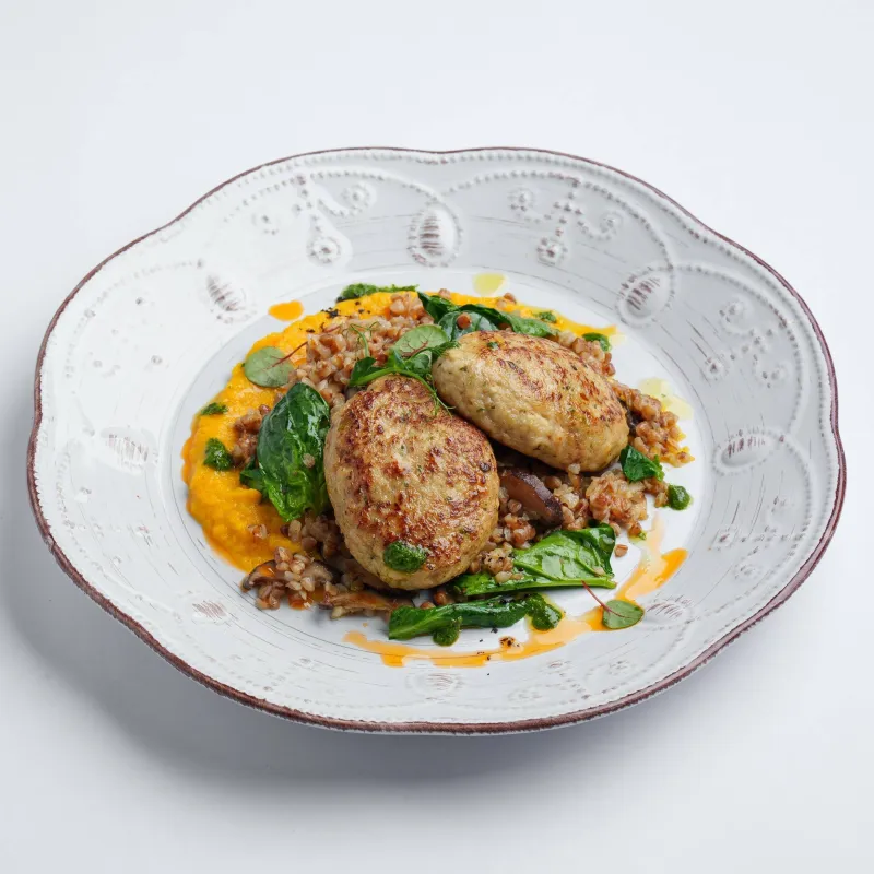 гречка с тимьяном и пармезаном, морковное пюре, котлеты из кролика