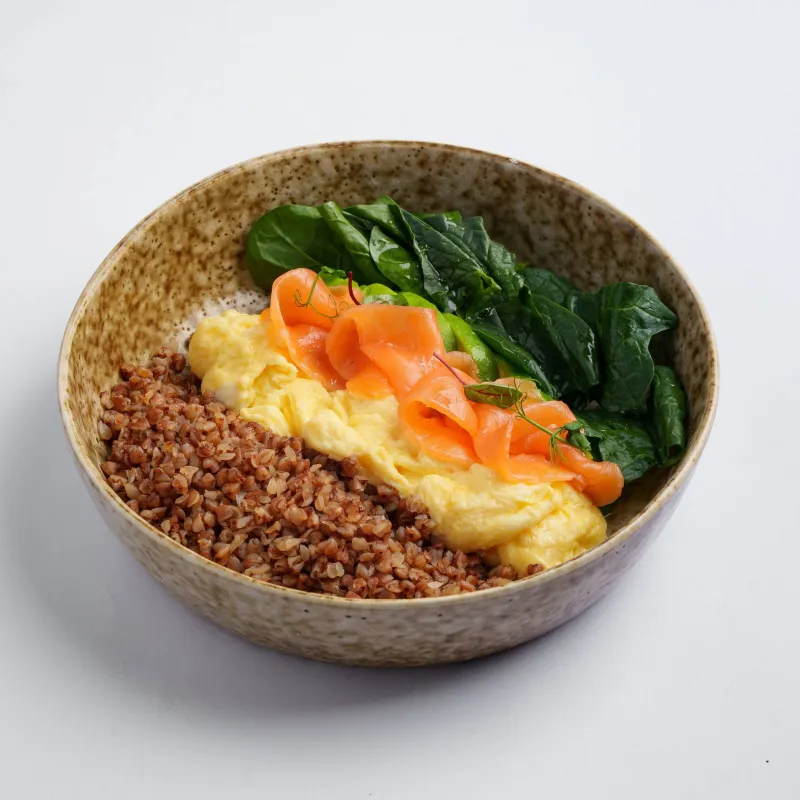 шпинат, авокадо, слабосоленый лосось, сливочный скрэмбл, киноа или гречка на выбор