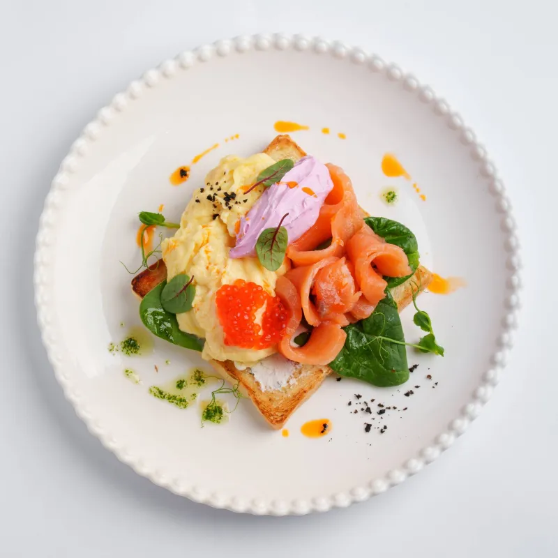Скрэмбл из яиц, лосось, свекольный мусс, тостерный хлеб, красная икра, сливочный сыр креметта, свежая зелень