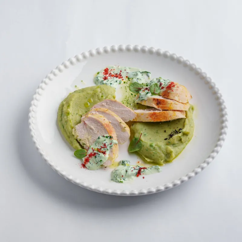 куриная грудка, пюре песто, шпинатный соус