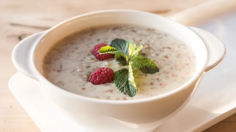 Молоко, крупа гречневая, сахар, соль, масло сливочное, ягода свежемороженая, мята