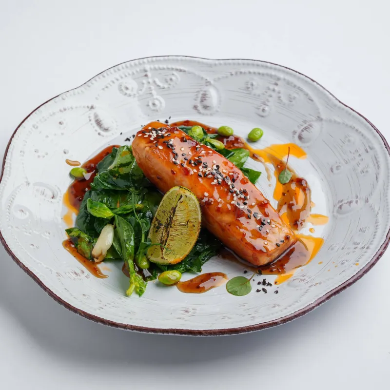 лосось, припущенный шпинат, эдамаме, соус терияки