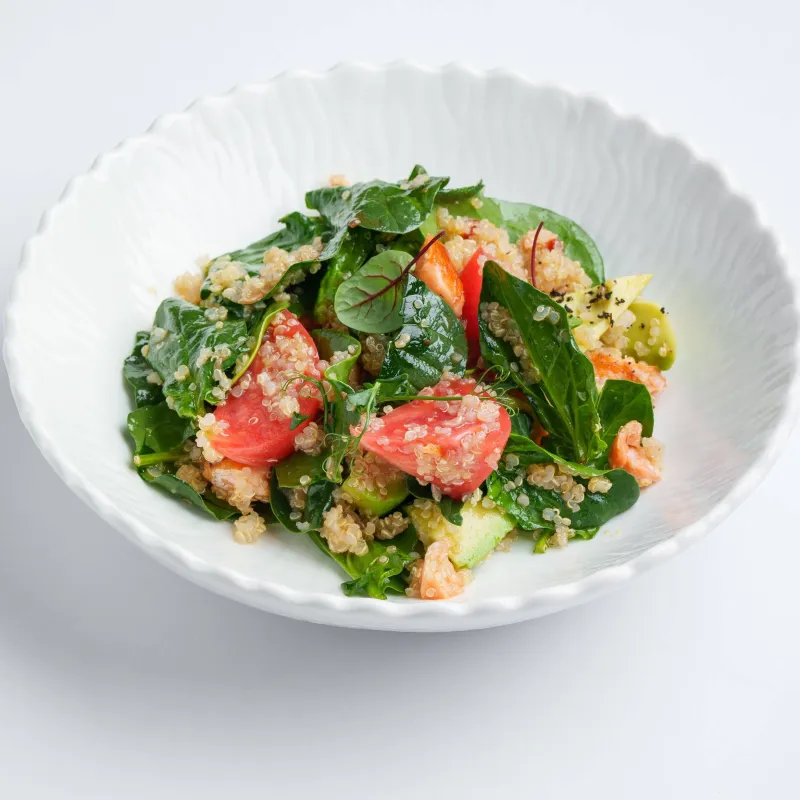 шпинат, томат, авокадо, киноа, лосось, соус терияки, сок лимона
