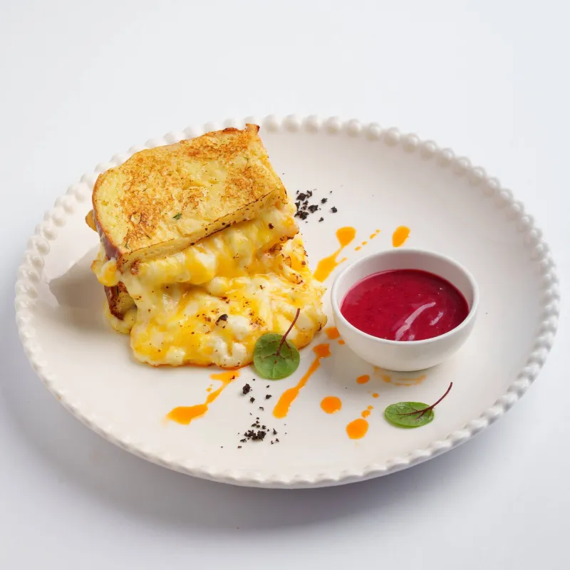 бриошь, моцарелла, чеддер, дор блю, сулугуни, подается с брусничным соусом