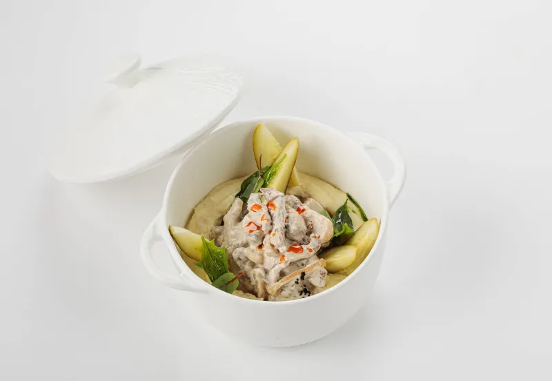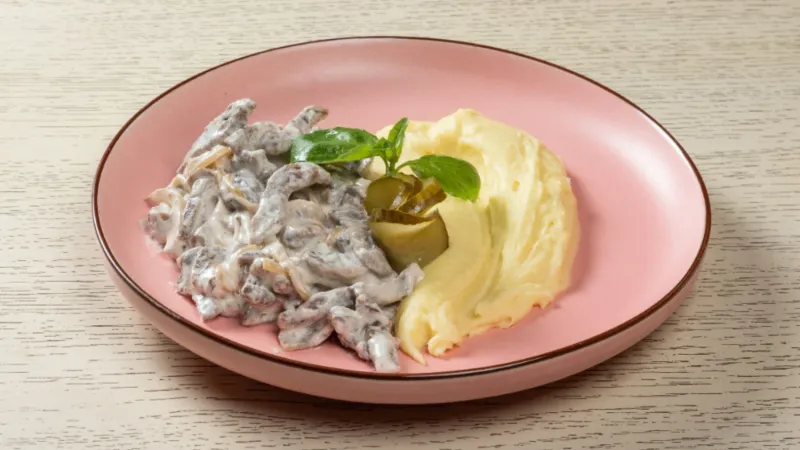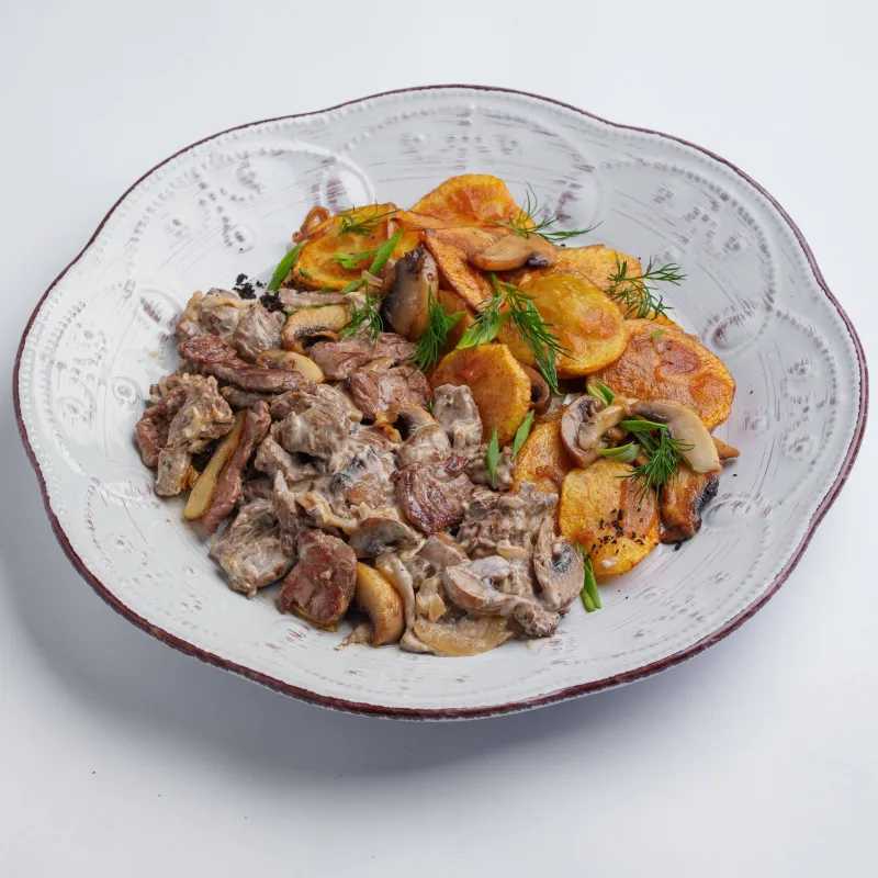 Тонко нарезанная говядина обжаренная с луком и шампиньонами, приготовленная в сливочно-сметанном соусе. Подается с картофельным пюре, маринованным огурцом и листиками шпината.