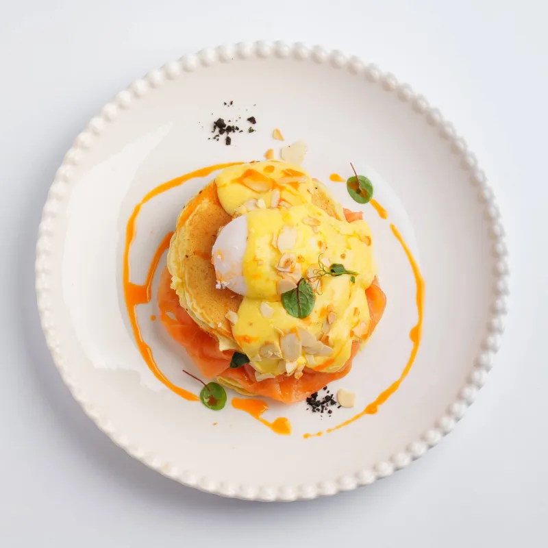 Панкейки, малосольный лосось и яйцо пашот, сырный соус, свежий укроп