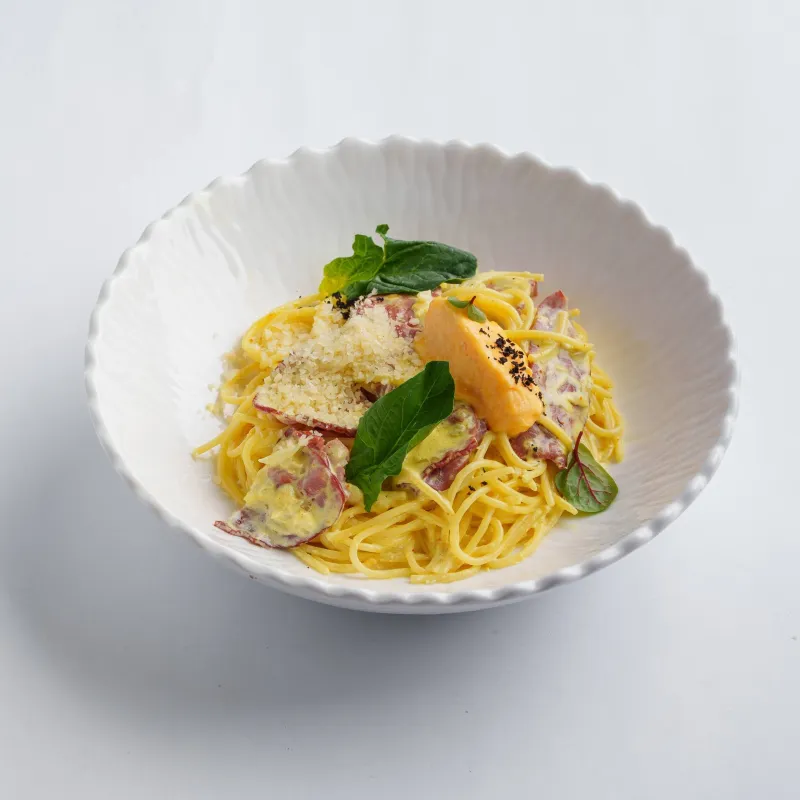спагетти, копченая говядина, сливки, микрозелень, пармезан, голландский соус