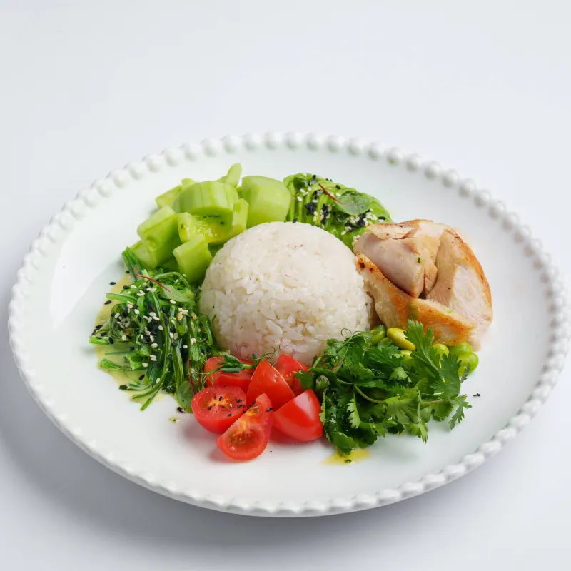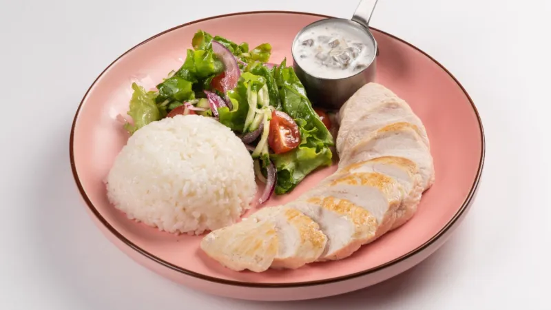 Куриное филе, рис, лист салата, огурец, черри, соус сливочно-грибной