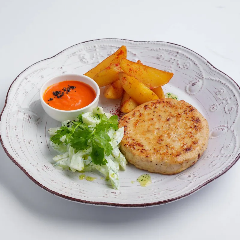 котлета куриная с моцареллой, огурец, стебель сельдерея, сметана, кинза, картофель, соус айвар
