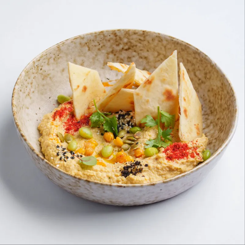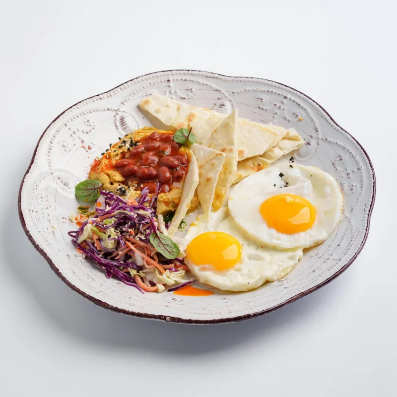 глазунья из 2 яиц, коул слоу, лепешка чапати, хумус из нута, фасоль в томате