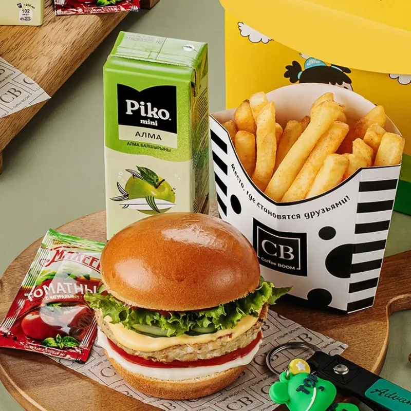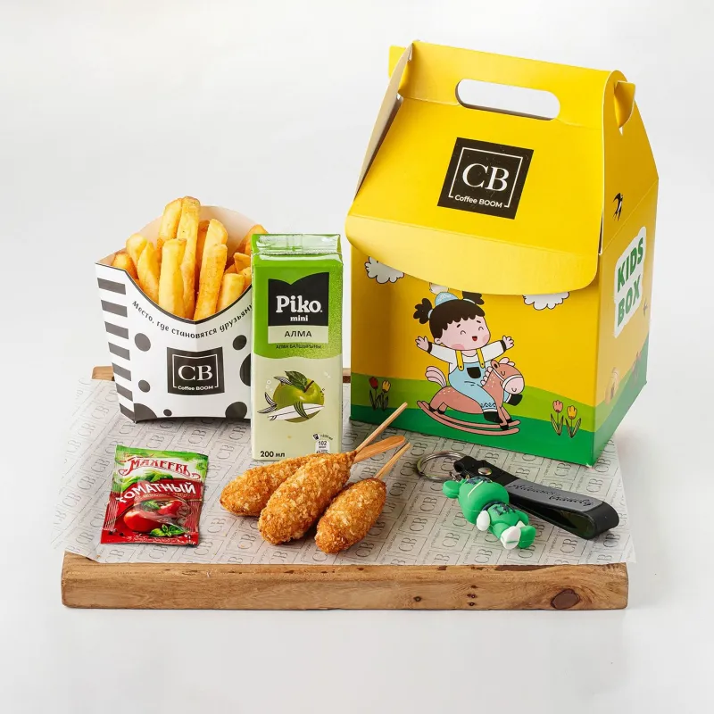Куриный гамбургер, картофель-фри, сок, игрушка