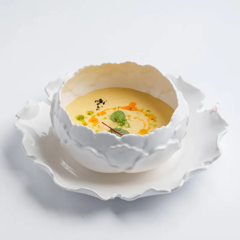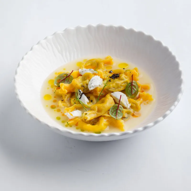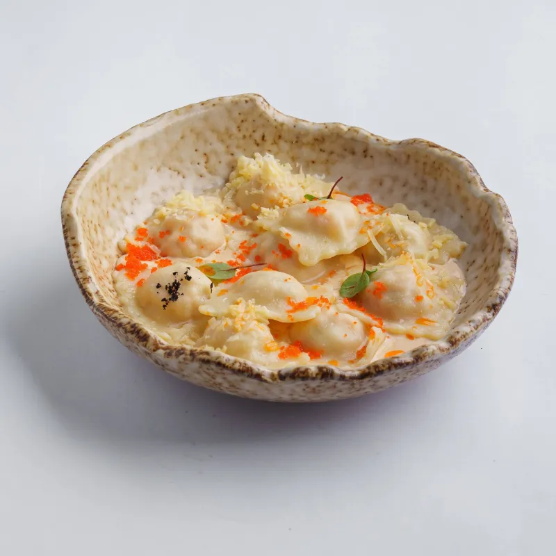 равиоли, сливочный соус, икра летучей рыбы