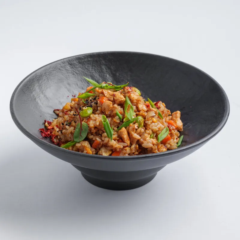 куриное филе, рис, кунжут, сладкий соус чили, зеленый лук
