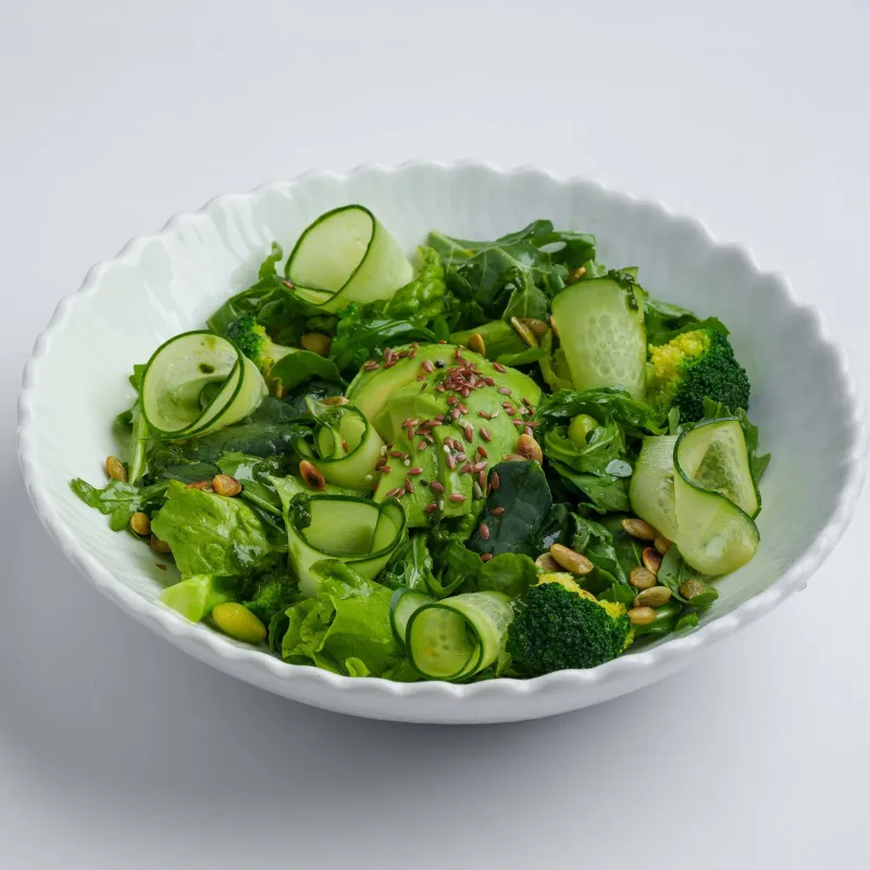 руккола, лист салата, шпинат, фасоль эдамаме, огурец, брокколи, авокадо, семечки тыквы и льна, дрессинг лимонный