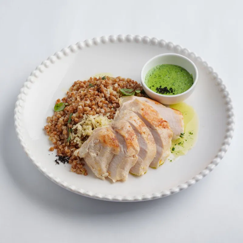 куриная грудка сувид, соус карри. гарнир на выбор: гречка с тмином или рис с овощами