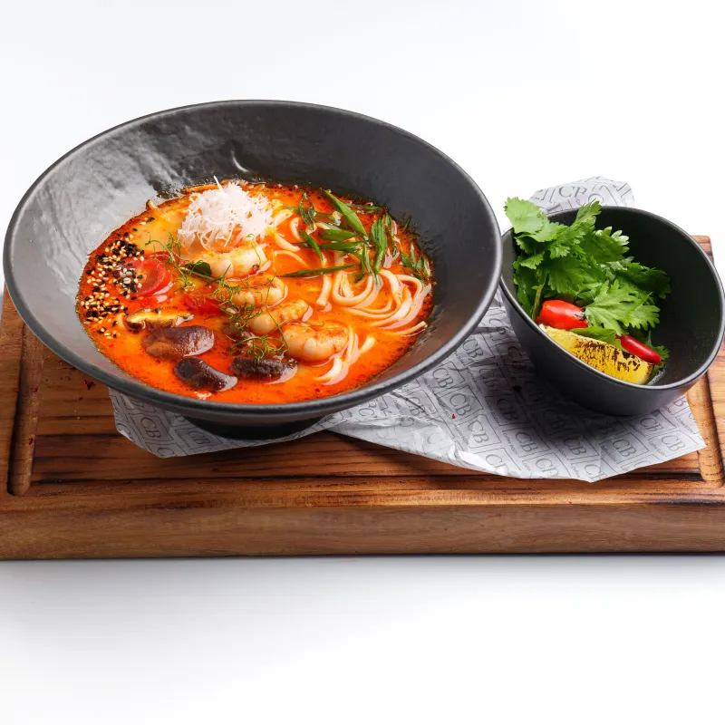 Наваристый бульон с лимонной травой, корнем галангала и кокосовым молоком. Тигровые креветки, лапша, томаты черри, грибы шиитаке, кинза, лайм, чили перец, дайкон, зеленый лук, кунжут