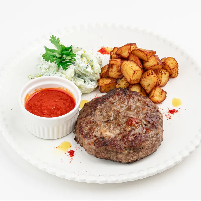 две говяжьи котлеты, с моцареллой, огурец, стебель сельдерея, сметана, кинза, картофель, соус айвар