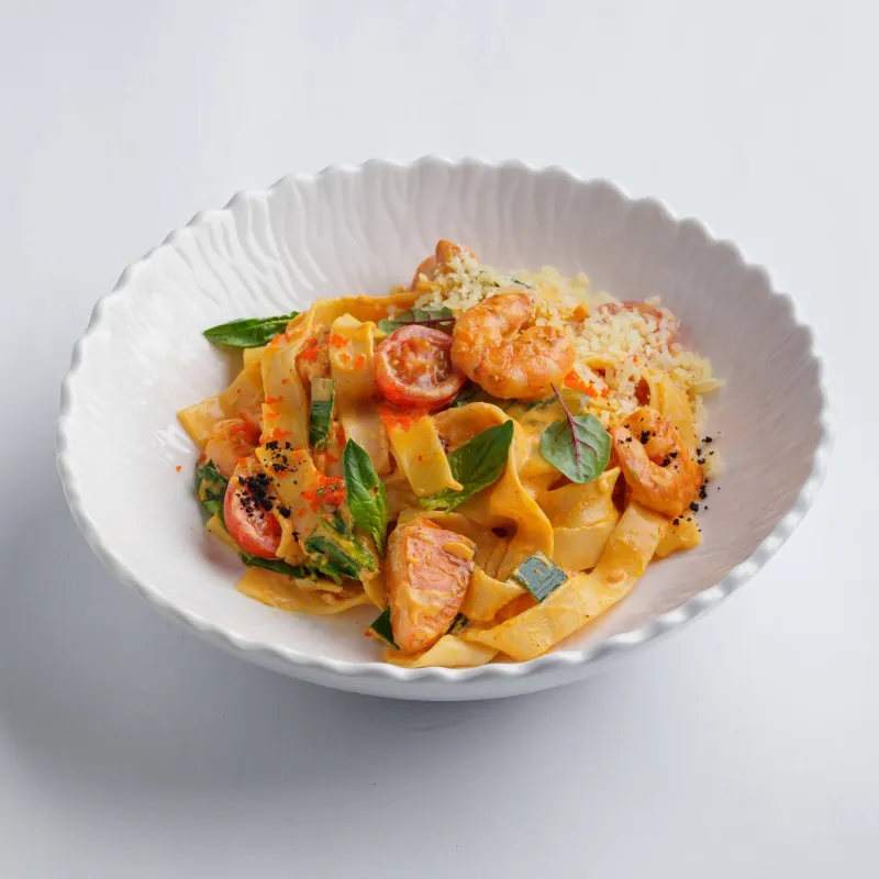 фетучини, семга, креветки, лук порей, шпинат, паприка, томаты черри, пармезан, сливочный соус