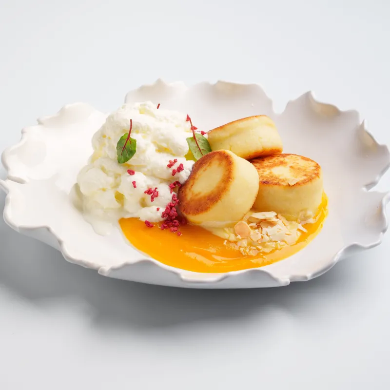 сырники с добавлением рисовой муки. Подаются с воздушными взбитыми сливками, заварным кремом,манговым соусом. Слайсы миндаля, сублимированной малины