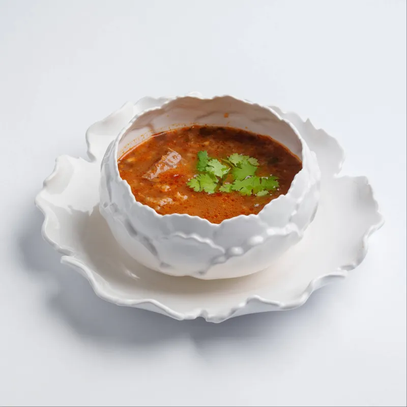Суп из говяжьей грудинки с рисом, томатами, свежей зеленью, чесноком и грузинскими специями