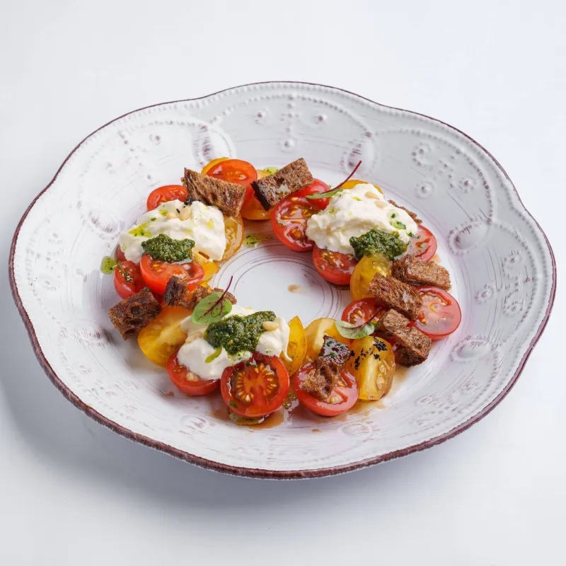 желтые и красные томаты черри, страчателла, гренки, соус бальзамик, соус песто