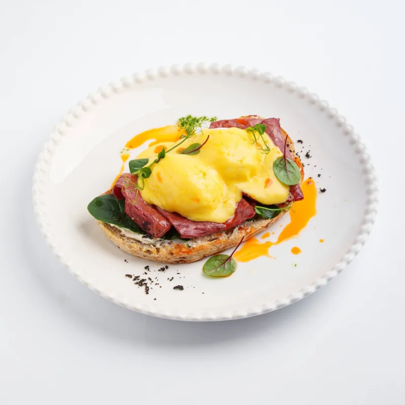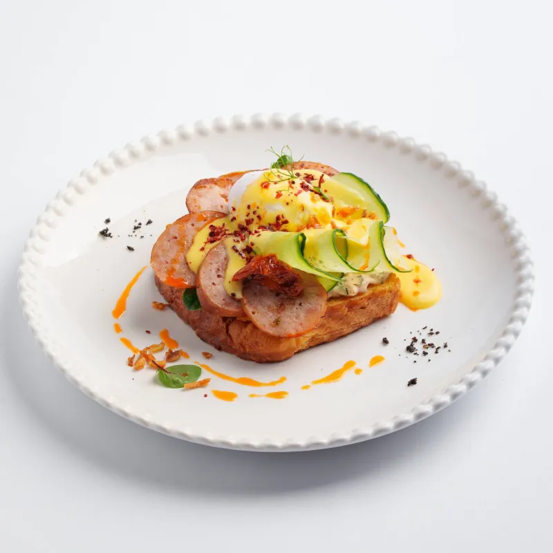 бриошь, соус ранч, вяленые томаты, ветчина из индейки, яйцо пашот, огурец, голландский соус