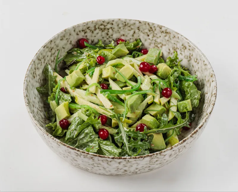 Листья салата, руккола, огурец, авокадо, зеленое яблоко, клюква, чука, кунжутная заправка.