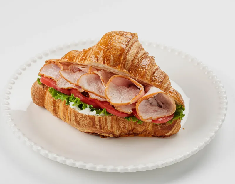Классический круассан, копченая индейка, помидор, лист салата, сливочный мусс.