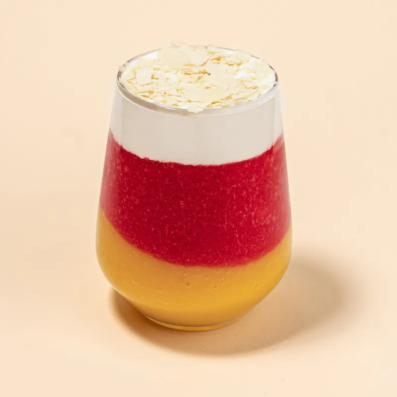 Пюре манго и пюре клубники на основе сиропов и творожная сырная пенка.