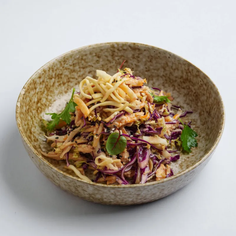 капуста пекинская, красная капуста, сухари будда, соус будда, цыплёнок, кунжут, кинза, микрозелень