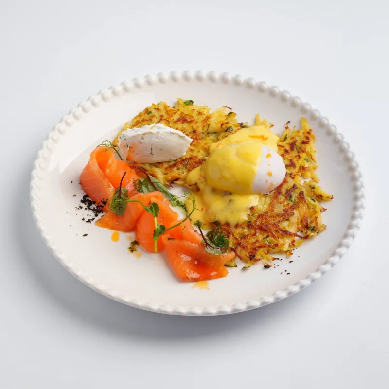 картофельные драники, слабосоленая лосось, яйцо пашот, крем чиз, голландский соус