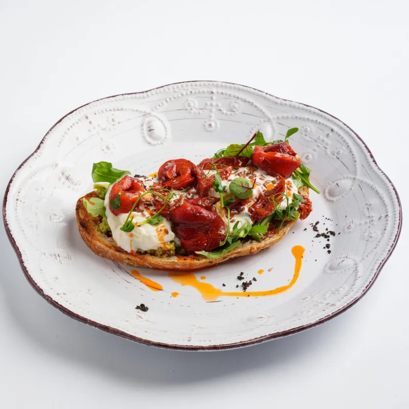злаковый хлеб, гуакамоле, руккола, страчателла, малиновый бальзамик, маринованный перец, вяленые томаты