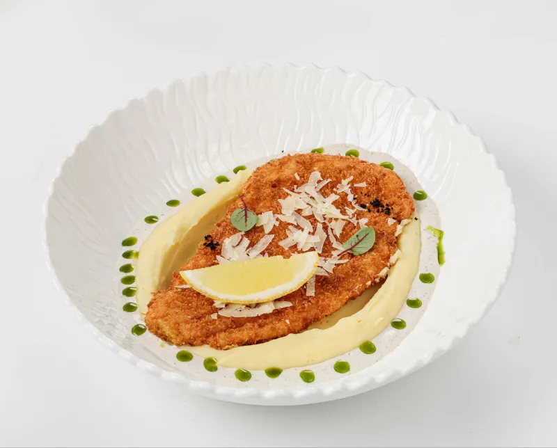 Нежное куриное филе в хрустящей панировке,воздушное картофельное пюре. Сливочный соус с шампиньонами, пармезан, долька лимона.
