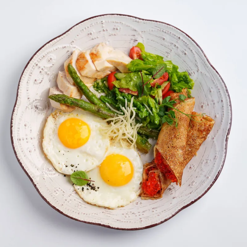 Глазунья из 2 яиц, блин, икра красная, зеленая спаржа, пармезан, куриная грудка, микс салат, черри, огурец