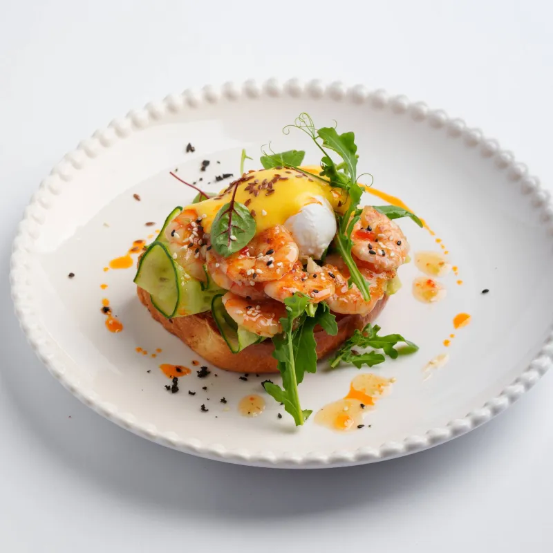бриошь, крем чиз, голландский соус, авокадо, огурец, тигровые креветки, соус свит чили, яйцо пашот, семечки