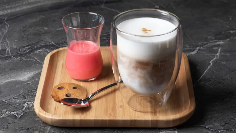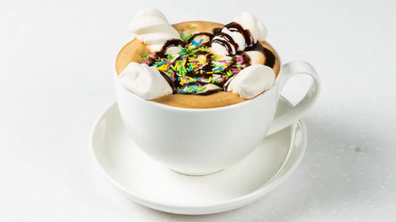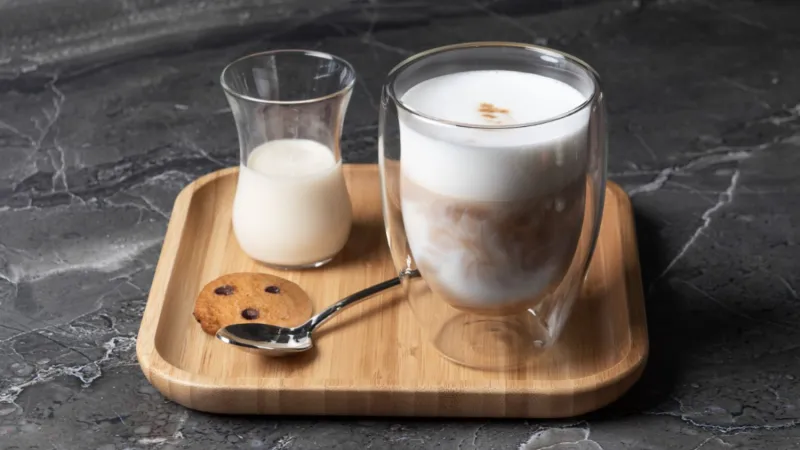 Молоко, сливки, двойной эспрессо, мед, шоколад и печенье
