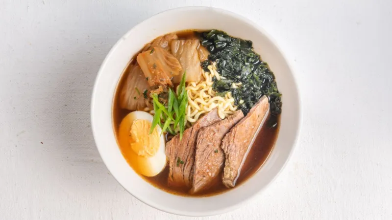 классический рамен, говядина, вакаме, яйцо, лапша, зеленый лук, дайкон